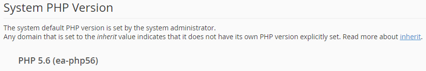 Since the System PHP Version is changing from 5.6 to 7.2, you may need to revert the PHP version for your domain back to 5.6 to maintain functionality of your site software. If you do wish to keep a domain on PHP 5.6, you can specify its PHP version in cPanel as shown below.