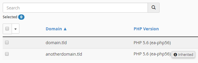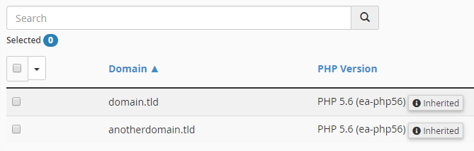 Once loaded, the MultiPHP Manager will list all of your accounts domains followed by their selected PHP version in the next column. Domains that are set to inherit the default PHP version will look something like this: