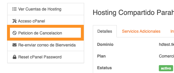 Paso 3: En la página siguiente usted observará un listado de él o los servicios que posee contratados. Dé clic en el recuadro naranja para observar los detalles del paquete de hospedaje o servidor que desea cancelar.