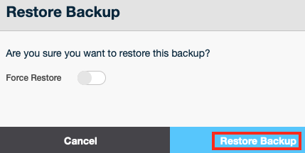 - Da clic en Restore Backup para iniciar el proceso normal de la restauración del respaldo. Sí se encuentran problemas, la restauración puede cancelarse incluso antes de que comience. Habilite la opción de Force Restore si desea intentar que el sistema restaure el respaldo incluso si se descubren problemas.