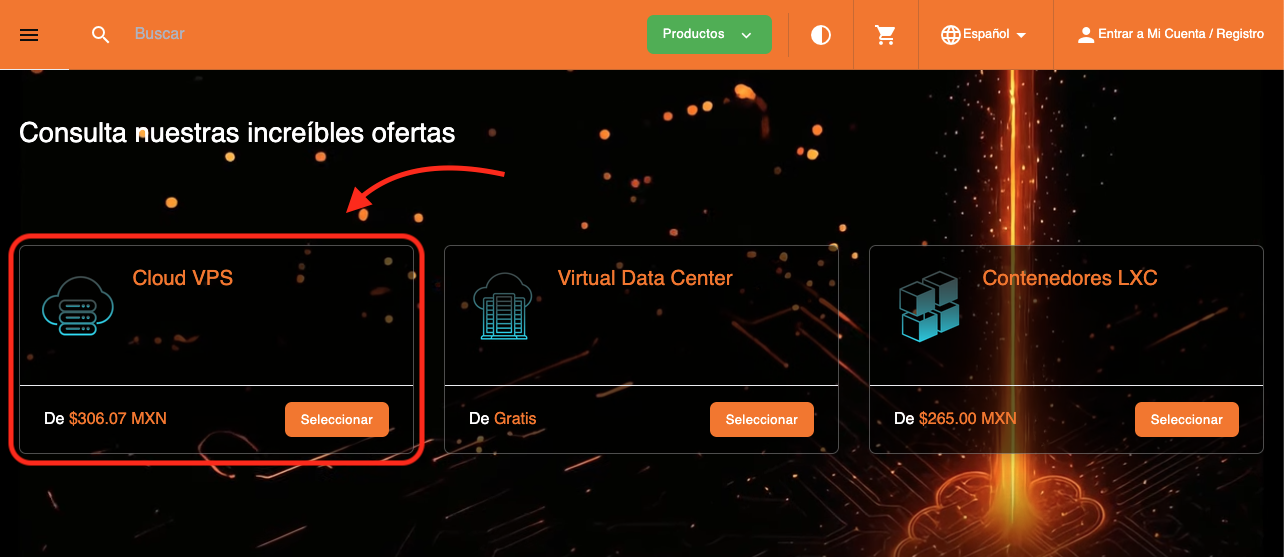 Una vez se ha seleccionado, veremos la siguiente interfaz, en la cual presionamos la opción de “Cloud VPS”: