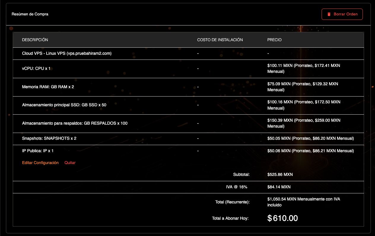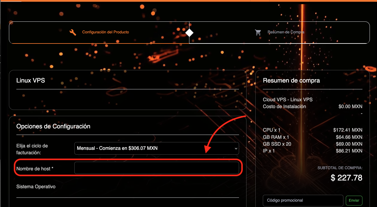 Dentro de este apartado, colocamos el nombre que tendrá nuestro VPS para identificarlo dentro de nuestra cuenta en HostBill (No tiene que ver con los dominios que estará almacenando, solamente es para identificar por si se adquieren más VPS y poder administrar correctamente los mismos).