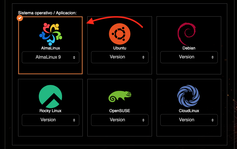 Seleccionamos la distribución que vamos a utilizar, en este caso AlmaLinux 9: