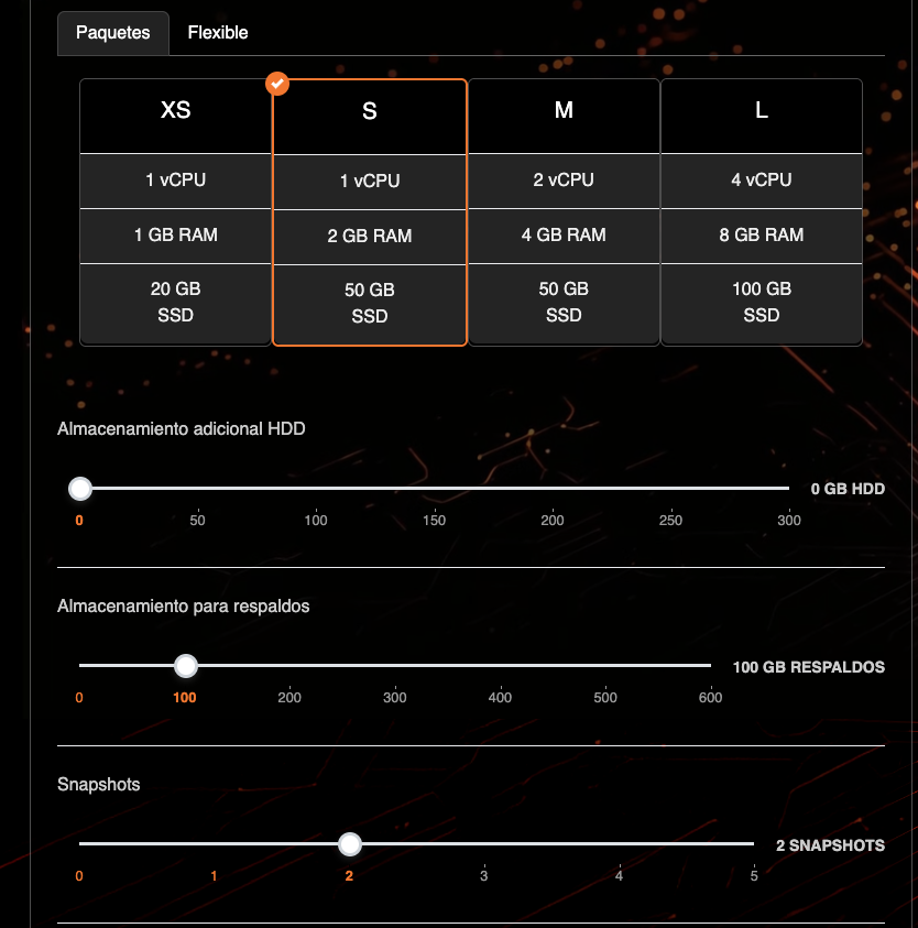 Para este ejemplo se utilizará la configuración de un paquete, más en concreto el “S” con almacenamiento para respaldos y snapshots.