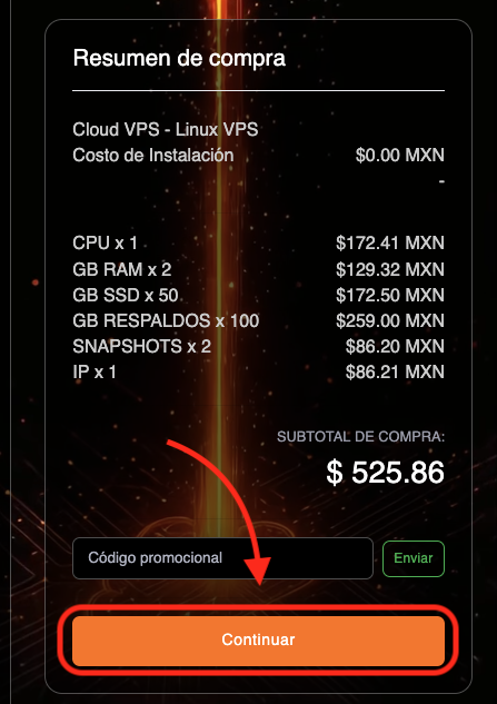 Seleccionamos el botón de “Continuar” que está a la derecha junto al subtotal del precio: