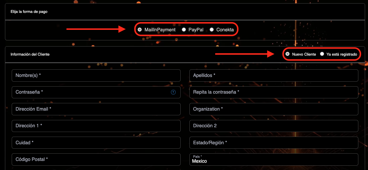 Al ir más abajo, colocamos el método de pago que preferimos utilizar así como llenar los datos solicitados en caso de ser nuevo cliente, de lo contrario, podemos colocar la opción de “Ya está registrado” para que nos auto-complete con los datos.